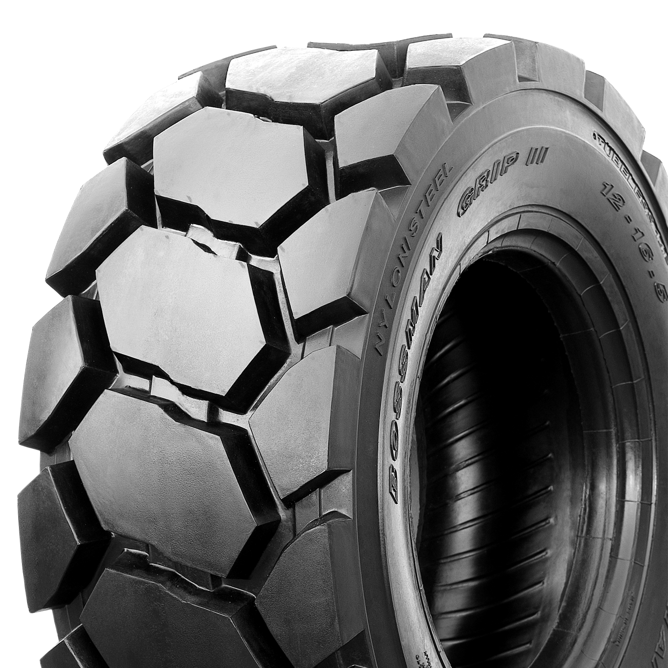 The Bossman Grip Steel II is a high-performance, steel-reinforced tire designed for extreme working conditions, offering superior tread stability and improved puncture resistance. Its extra-deep tread ensures a long service life, while the center blocks resist skid wear.